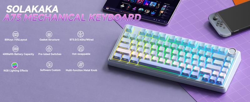 SOLAKAKA A75 Wireless 75% Mechanical Keyboard Features Hot-Swappable Keys, RGB Lighting, a Multi-Function Knob, Sealed Keys, PBT Keycaps, and a Creamykeyboard Design. It Is Suitable for Pc/Mac.