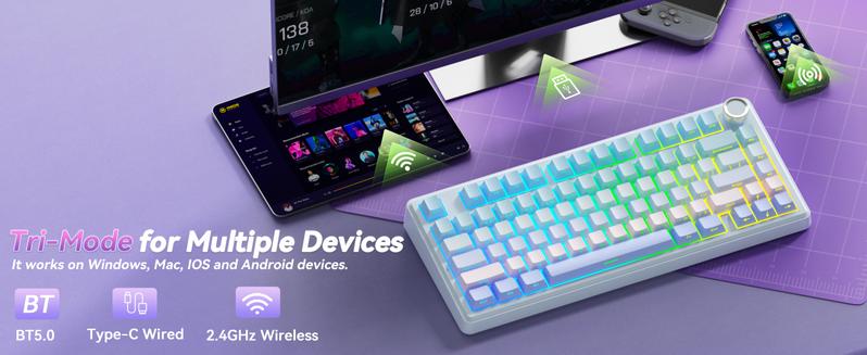- Tri-mode Connection Keyboard: This wireless gaming keyboard supports 2.4GHz wireless connectivity, BT5.0, and USB-C wired connection. It can connect to up to five devices simultaneously. The wireless keyboard is also compatible with Windows, Mac and IOS systems, breaking through system limitations. And it supports locking the WIN key and full N-key rollover, preventing accidental presses during intense gaming sessions. This computer keyboard suitable for desktops, laptops, tablets and smartphones, it meets virtually all your daily connectivity needs