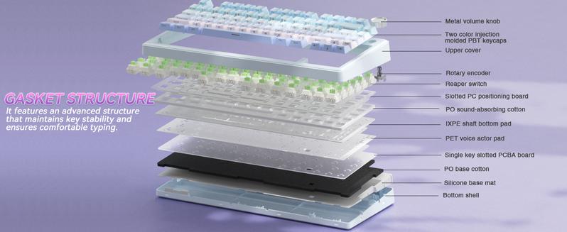 - Superior Structure Creamy Keyboard: SOLAKAKA thocky keyboard features a gasket mount structure. This structure consists of a PCB single-key slotting process, IXPE shaft bottom pad, PET voice actor pad, silicone base mat, PO sound-absorbing cotton and PO base cotton. This can eliminate the cavity sounds and noise inside the gaming keyboard, delivering a creamy keystroke sound and a soft hand feel